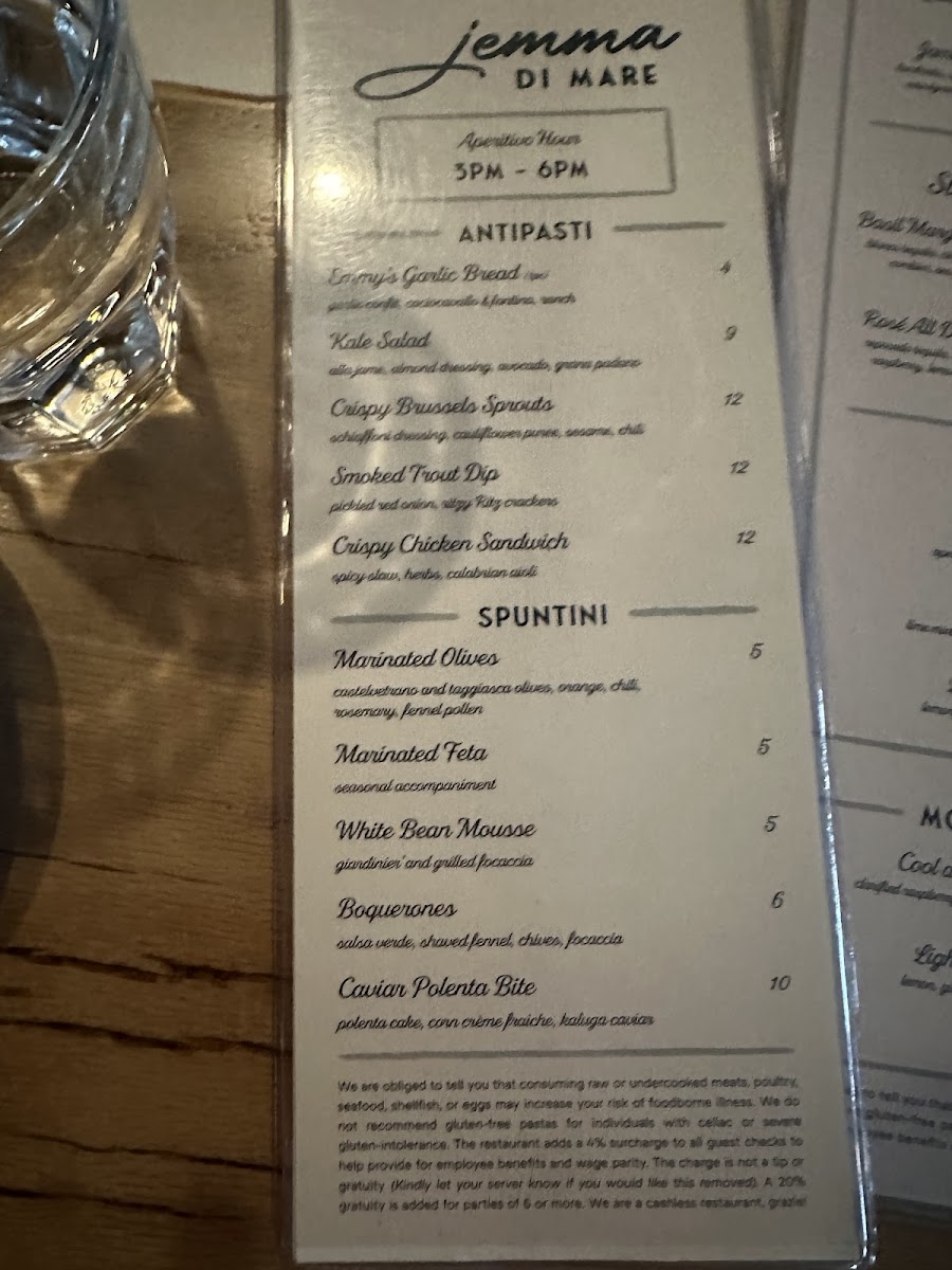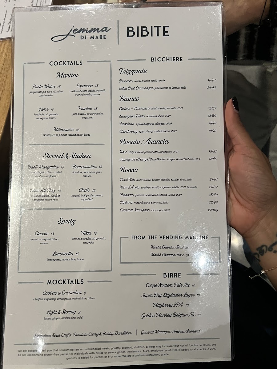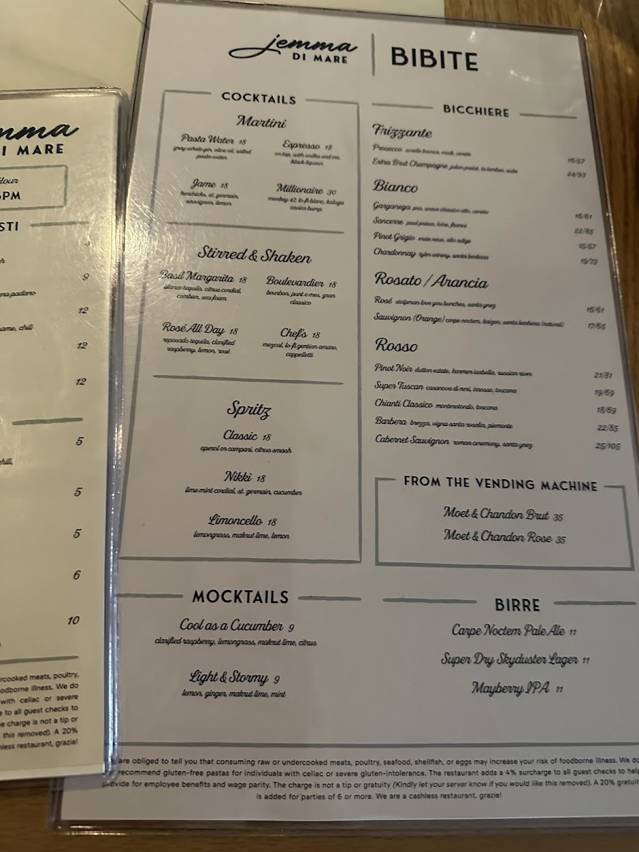 At Ospi Brentwood, the drinks menu leans into creative Italian‑inspired cocktails with a dedicated JEMMA COCKTAILS section that includes house‑style classics like the Negroni Della Casa, the tiki‑twist Tikigroni, the rich Boulevardier, the signature Chef’s Negroni, and a refreshing Spritz-each crafted to complement the vibrant, pasta‑forward cuisine. The SPRITZ CART further expands the spritz offerings with playful variations such as The Traditional, the bold The Pornstar, the summery The Hot Girl Summer, the fruity The Guapo Guava, and the floral The Hugo, giving diners a spectrum of sparkling, aperitif‑style options to enjoy before or alongside their meal.